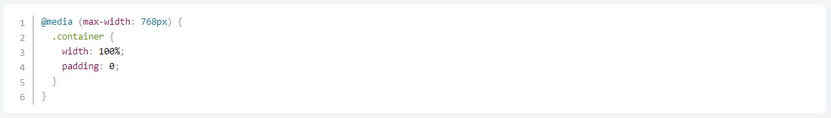 Здесь мы видим, что при ширине экрана меньше 768 пикселей (обычно это смартфоны) блок `.container` расширяется до 100% ширины экрана и убирается внутренняя отступка.